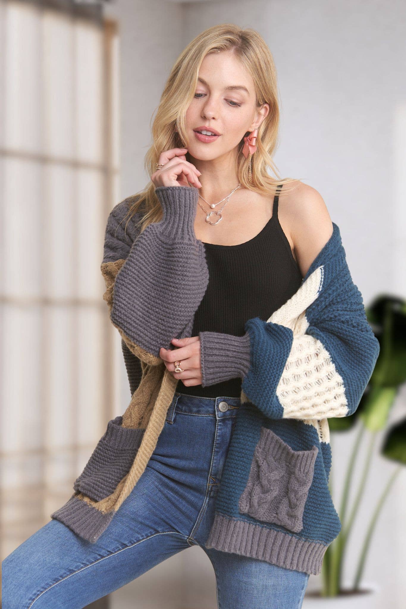 PLUS SIZE LONG PUFF SLEEVES COLORBLOCK SWEATER CARDIGAN WITH POCKET
