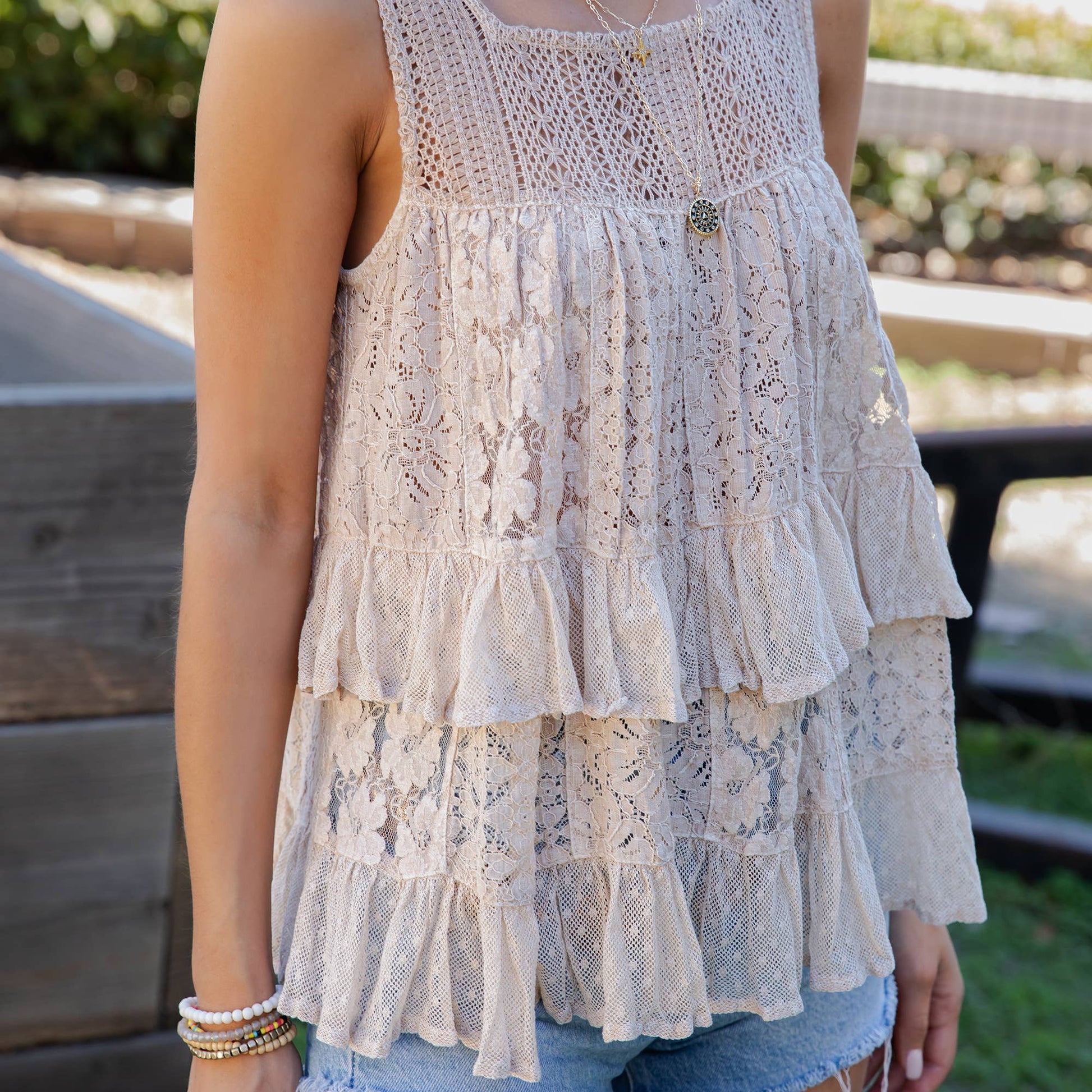 • Style: Sleeveless tiered lace ruffle top