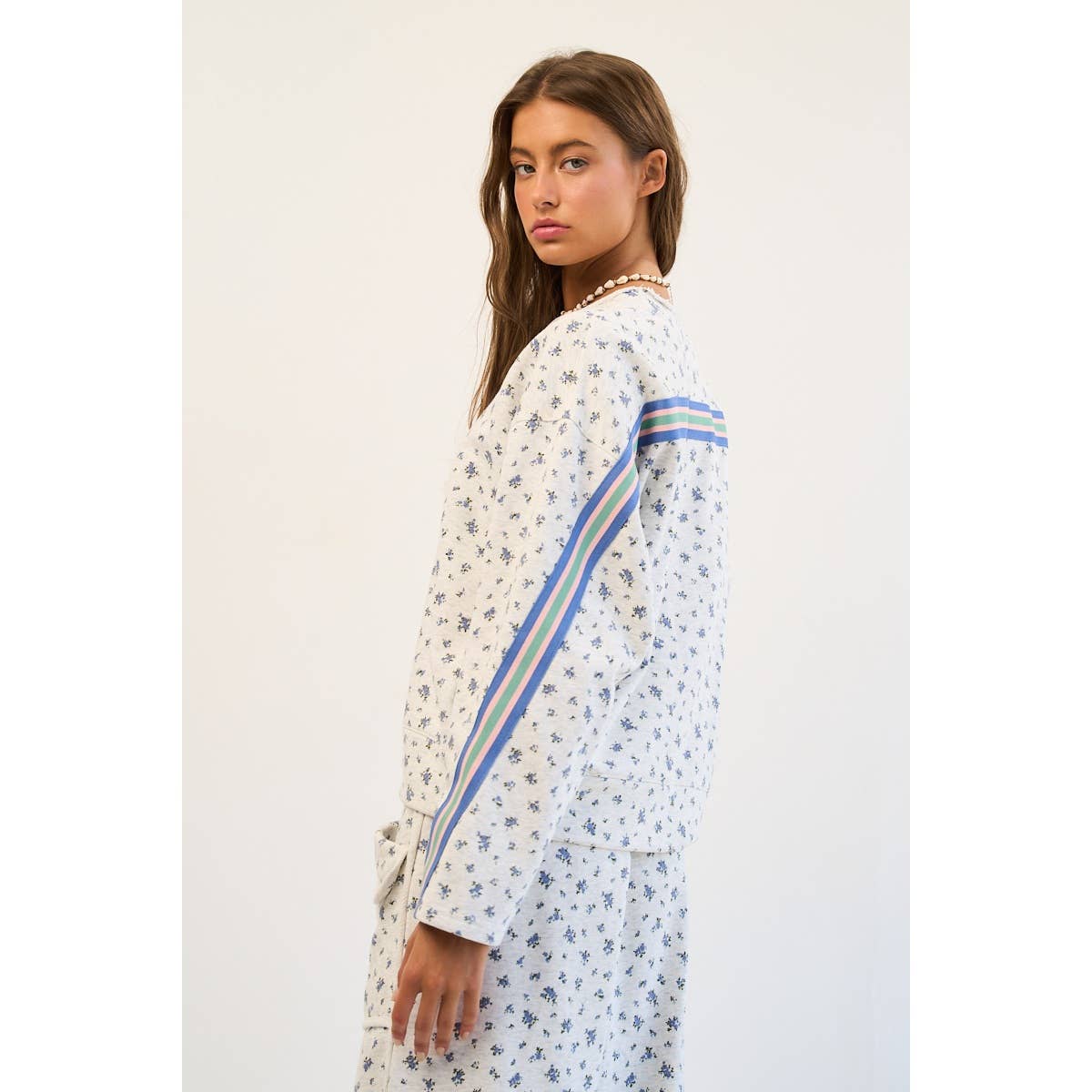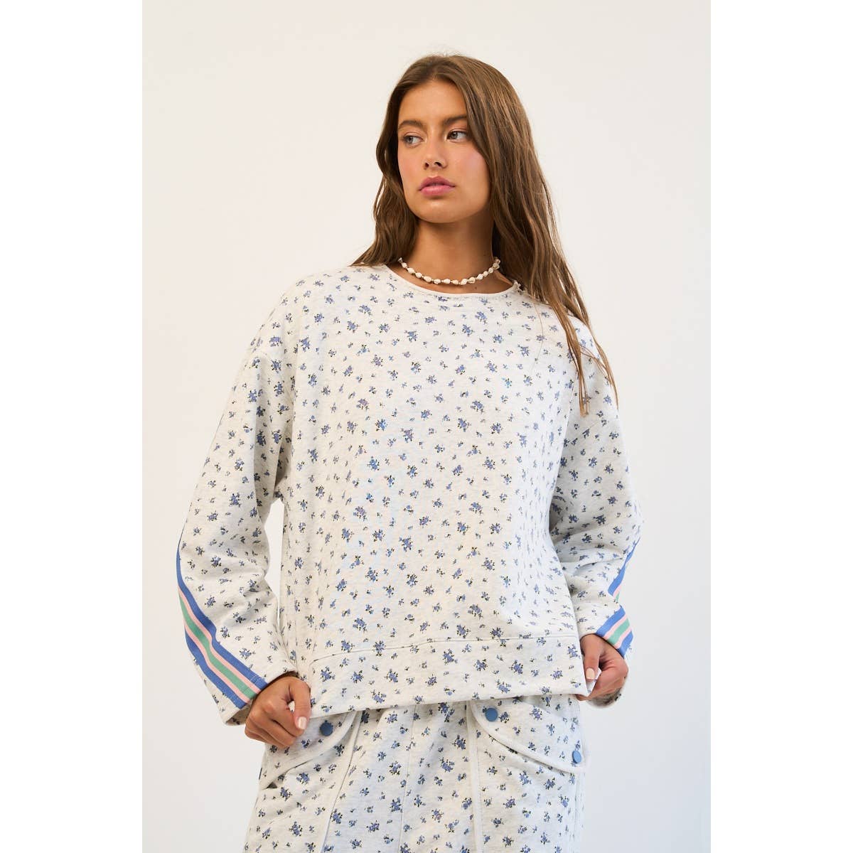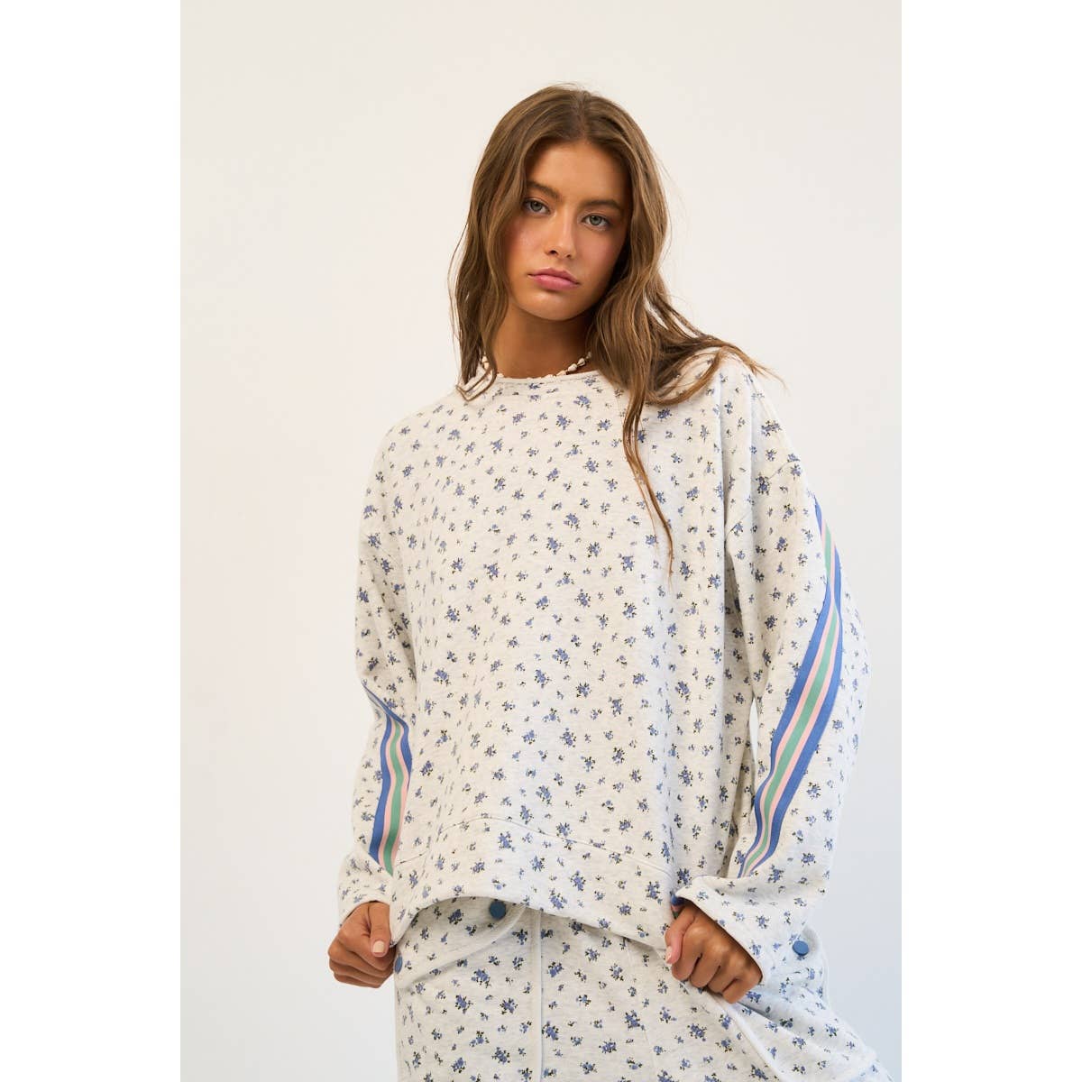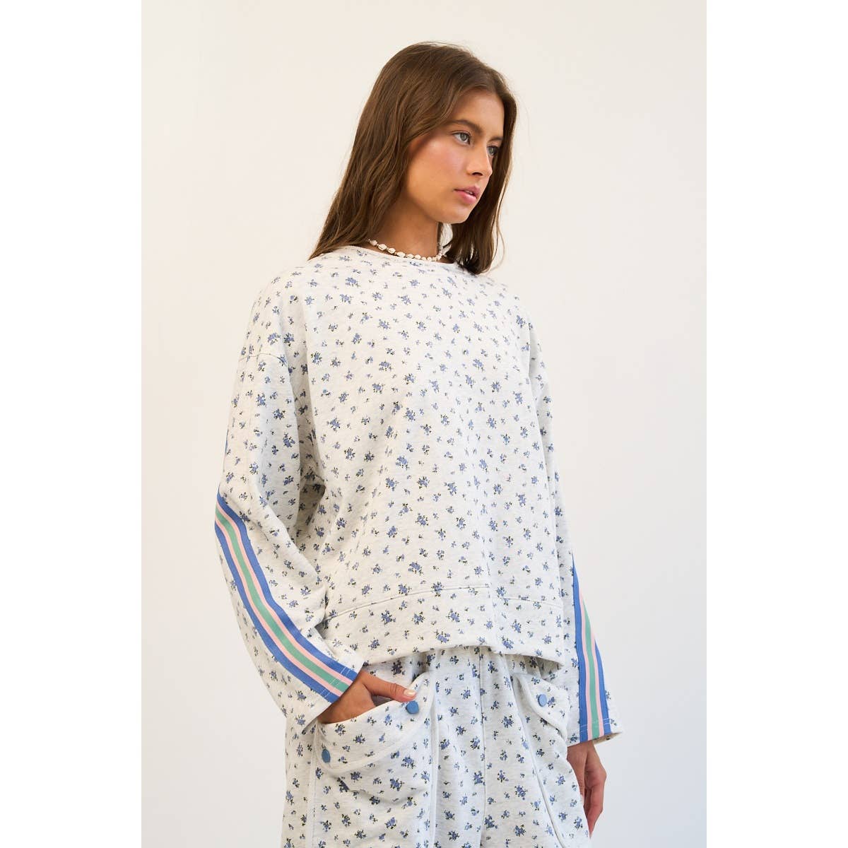 Bring a playful twist to your everyday look with this floral print sweatshirt featuring retro-inspired striped sleeves. Designed in soft, breathable fabric, this pullover offers both comfort and style with its relaxed fit, allover mini floral pattern, and pastel stripe details down the arms. Perfect for lounging, casual outings, or layering, it pairs effortlessly with denim, joggers, or matching bottoms.