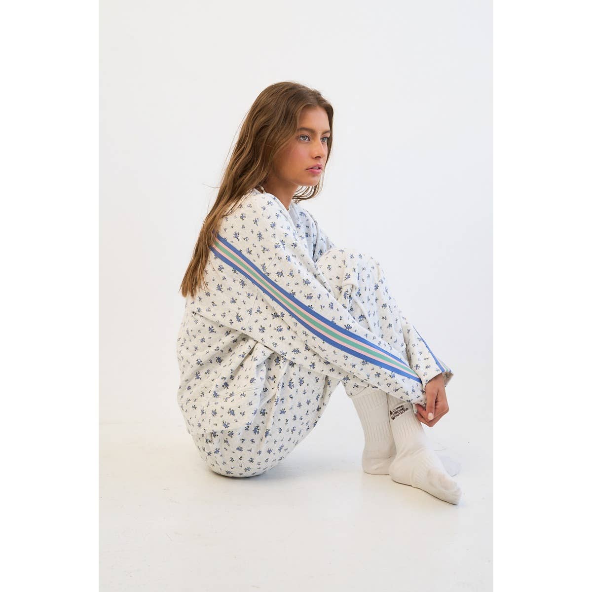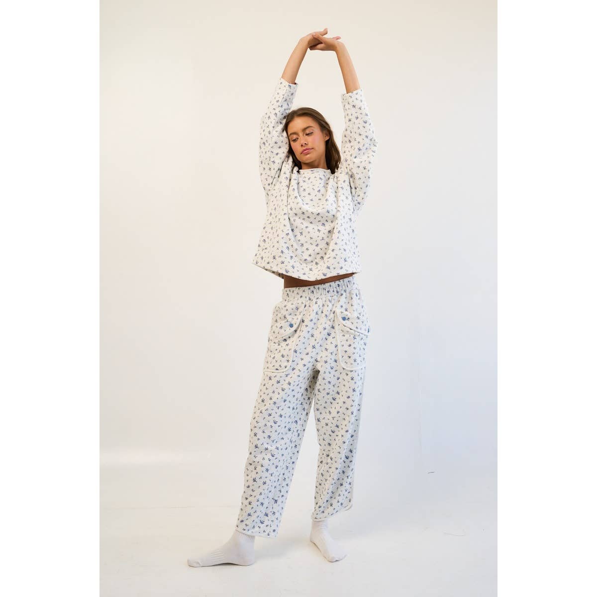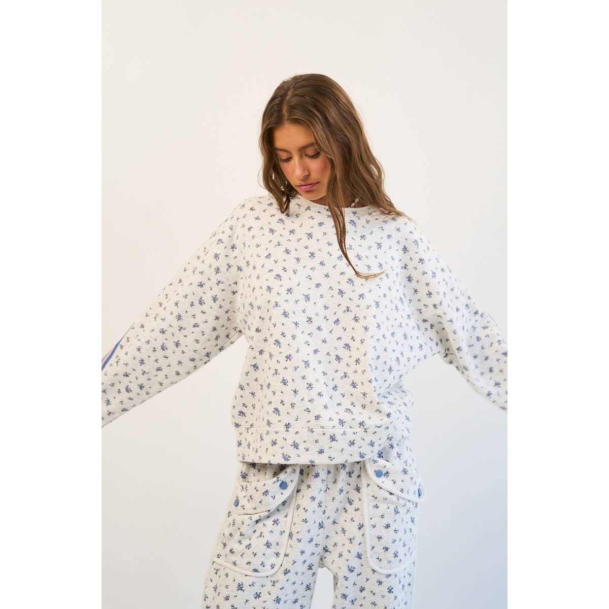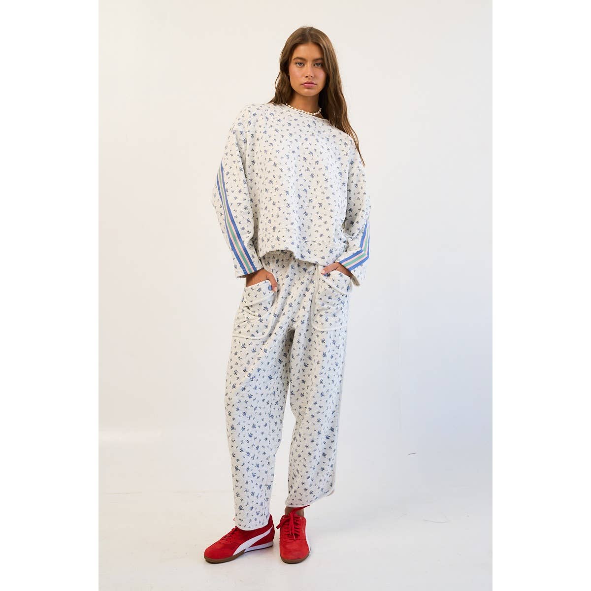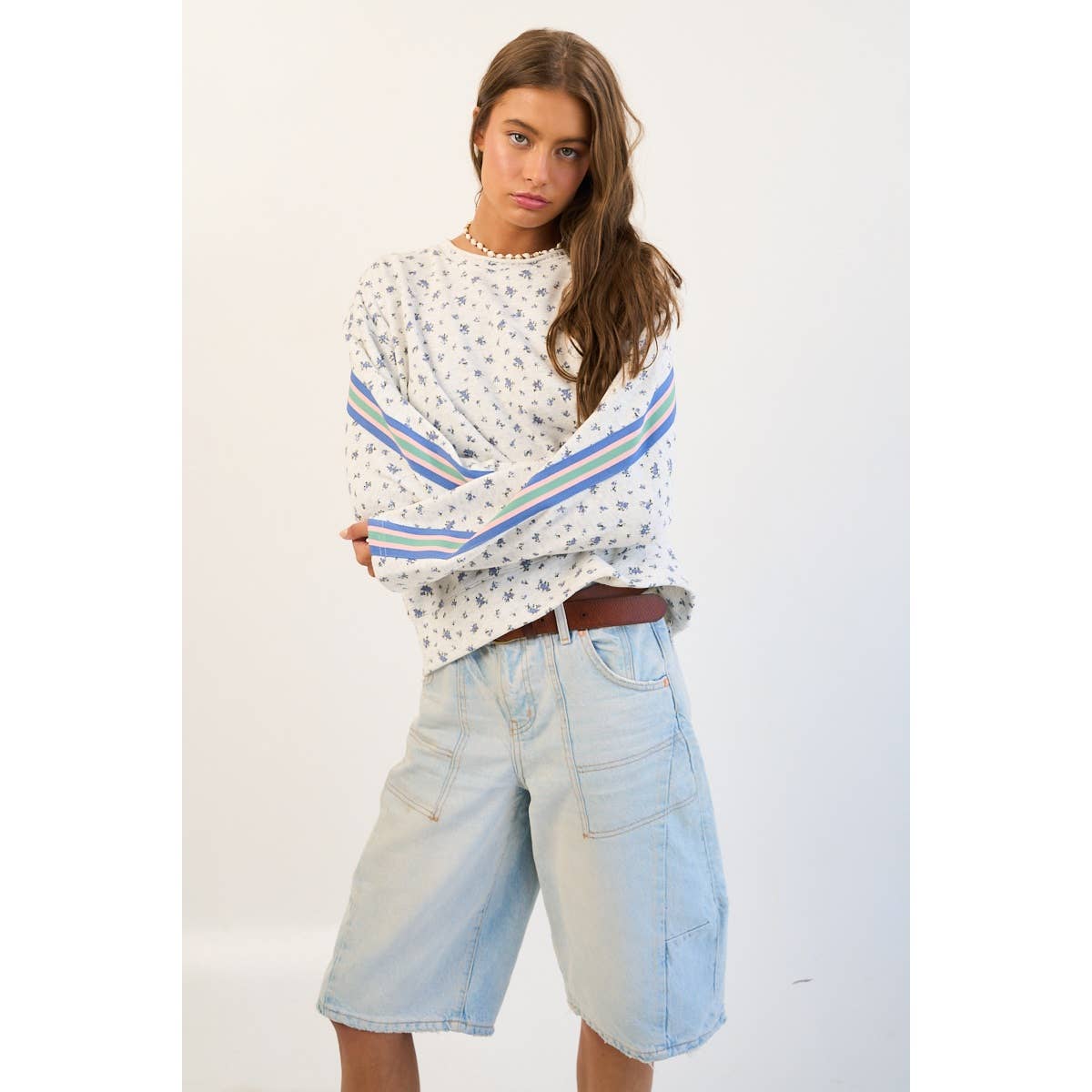 Bring a playful twist to your everyday look with this floral print sweatshirt featuring retro-inspired striped sleeves. Designed in soft, breathable fabric, this pullover offers both comfort and style with its relaxed fit, allover mini floral pattern, and pastel stripe details down the arms. Perfect for lounging, casual outings, or layering, it pairs effortlessly with denim, joggers, or matching bottoms.
