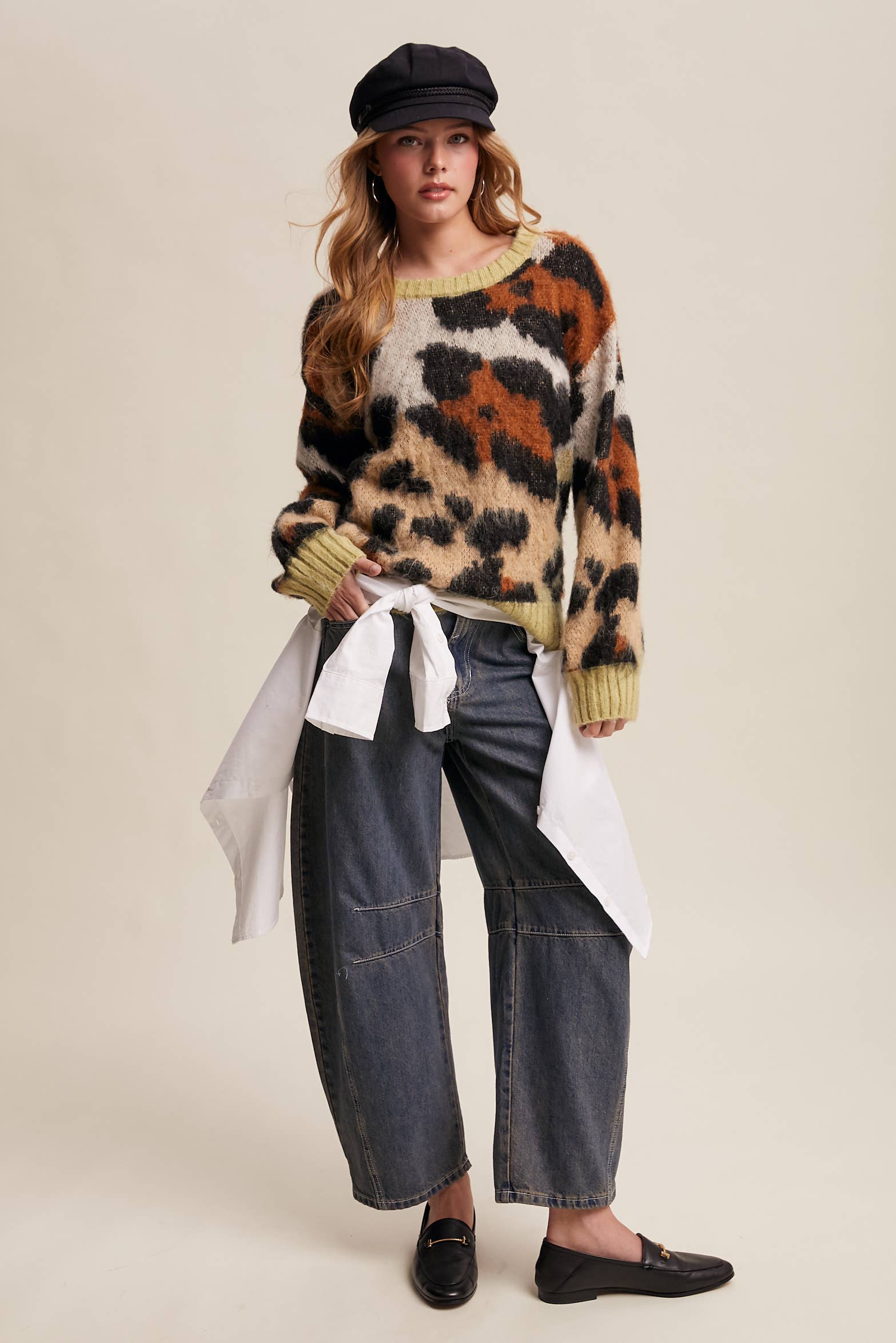 A dreamy blend of abstract art and wild animal print, this sweater brings playful edge and cozy comfort to your winter wardrobe.