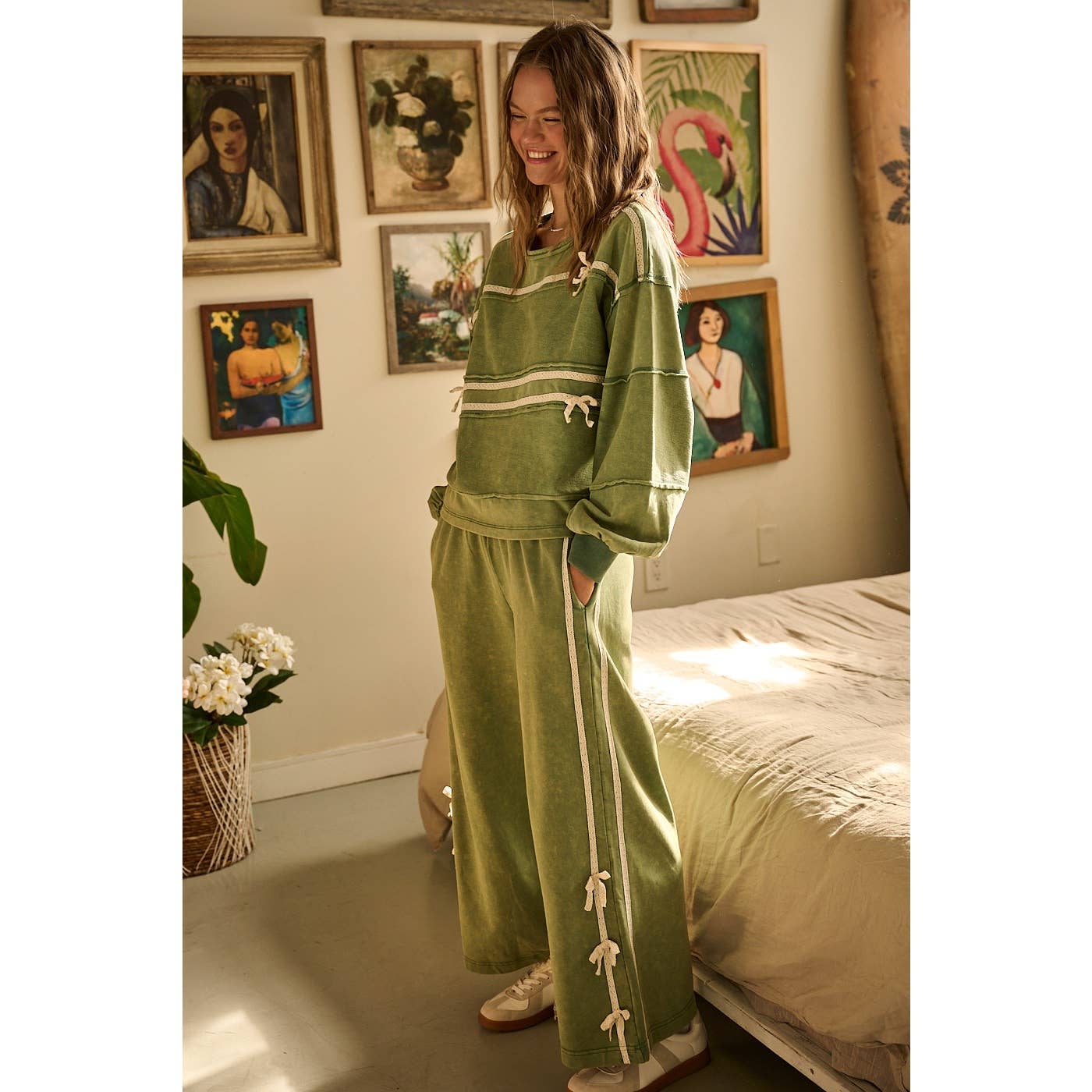LACE BOW MINERAL WASH LONG SLEEVE SWEATSHIRT